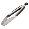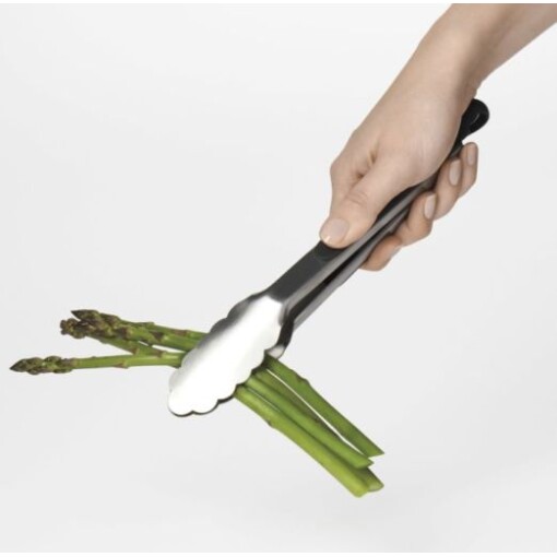 Oxo’s tongs feature brushed stainless steel with soft, non-slip handles and comfortable thumb rests. Easily lock in the closed position for convenient storage. The large pull-tab for locking also doubles as a hole for hanging.