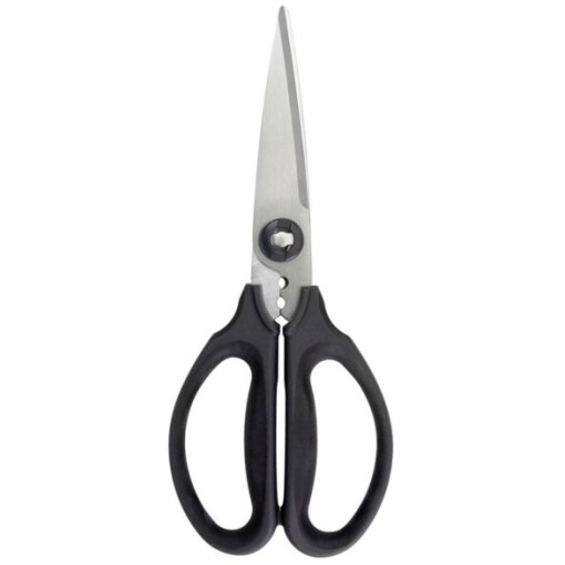 Keep these Oxo Kitchen and Herb Scissors/ Shears handy for cutting meat, veggies, twine and more. The soft handles feature cushioned pads to absorb pressure. The herb stripper above the handles removes fresh herbs from tough stems, and the micro-serrated blades separate for easy cleaning.