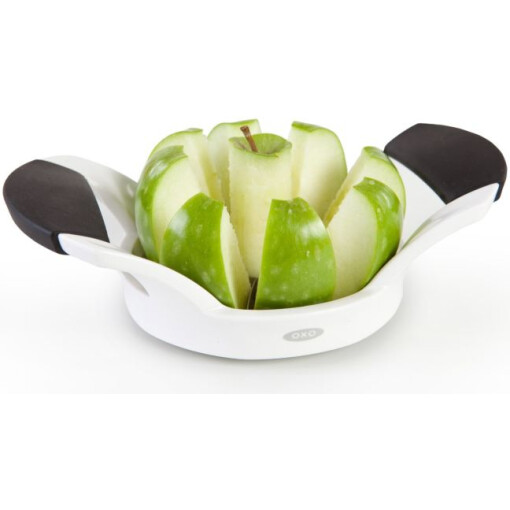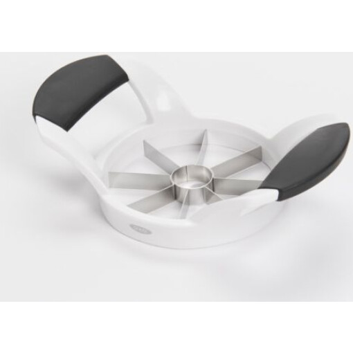 Core and slice apples and pears with ease with the OXO Good Grips Apple Divider. The Apple Divider features sharp, stainless steel blades that cut cleanly through fruit. Soft, wide handles take the pressure off your hands, and are raised to assure ample clearance between your hands and the cutting surface.