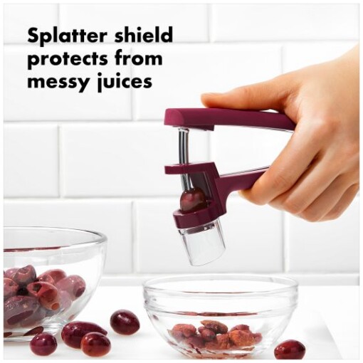 With the OXO Good Grips Cherry/Olive Pitter, baking cherry pies, canning cherries and making homemade preserves are no longer the pits. The Pitter features a removable splatter shield that directs juices downward and prevents them from soiling your work a