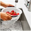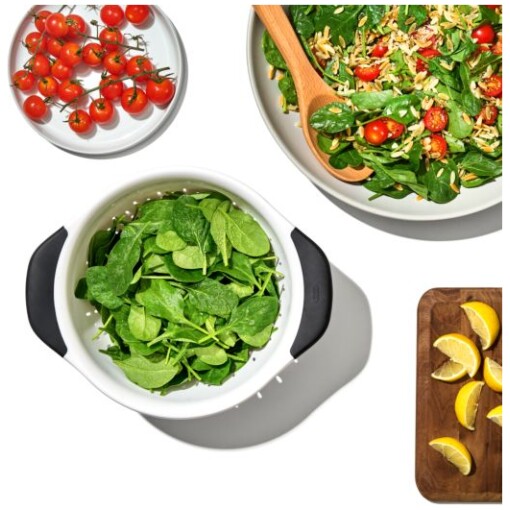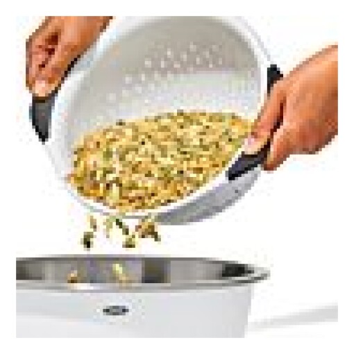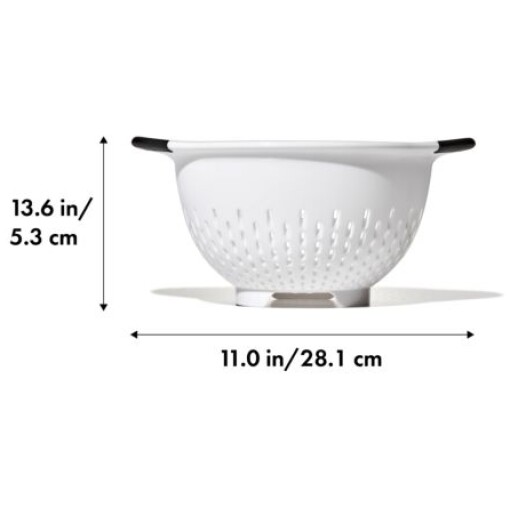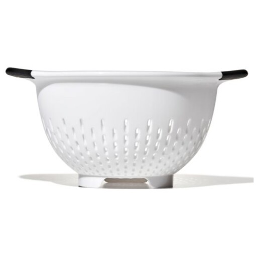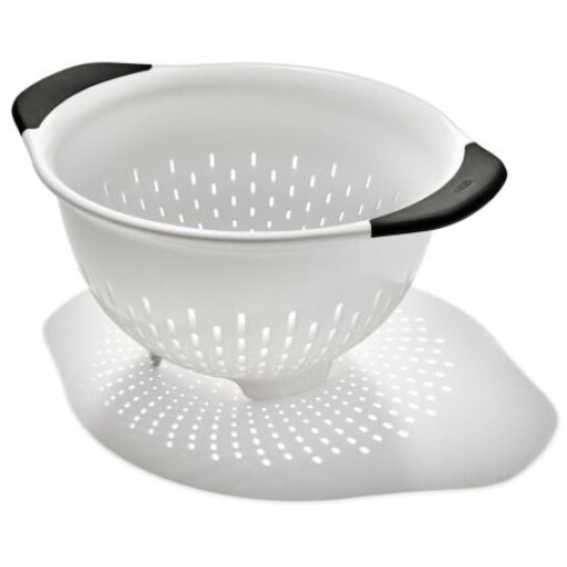 The OXO Good Grips 3-Qt/2.8-L Colander is an efficient tool for rinsing veggies and straining pasta. Contoured feet keep Colander steady in sinks, and the non-slip handles provide a comfortable grip, even when your hands are wet. The elevated design keeps colander away from the bottom of the sink to prevent pooling. The sturdy construction can handle heavy food and the smooth material is easy to clean. Dishwasher safe.