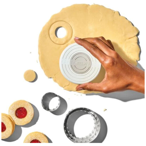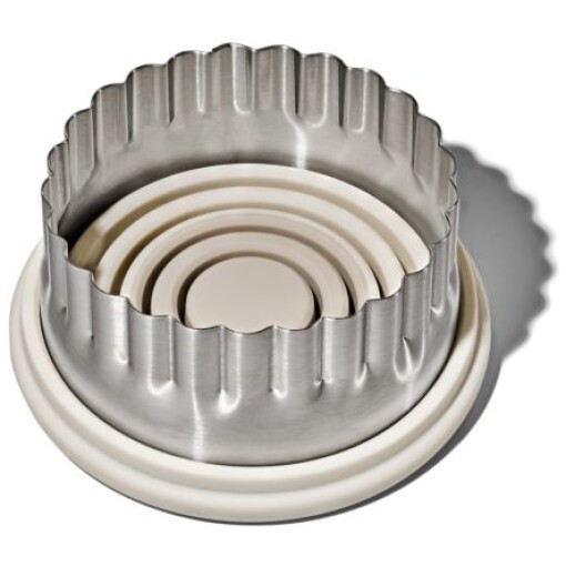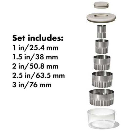 Whether you’re baking cookies, biscuits or scones, the OXO Good Grips Double-Sided Cookie & Biscuit Cutter Set has got the size you need for a uniform batch. Plus they’re reversible—one side is flat and the other is scalloped to give those biscuits, scones or tarts the delicate, fluted edge they deserve. The set of five stainless steel cutters come in 1 in/25.4 mm; 1.5 in/38 mm; 2 in/50.8 mm; 2.5 in/63.5 mm; and 3 in/76 mm sizes. With so many sizes, the possibilities are endless—use them to cook an egg, core an apple or make dumplings. Plus, the set features a soft, non-slip silicone hand guard that’s comfortable and helps prevent hand fatigue while cutting dough. We’ve also included a storage case with lid that makes it simple to store the cutters when not in use. Dishwasher safe.