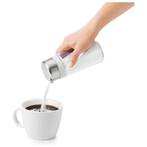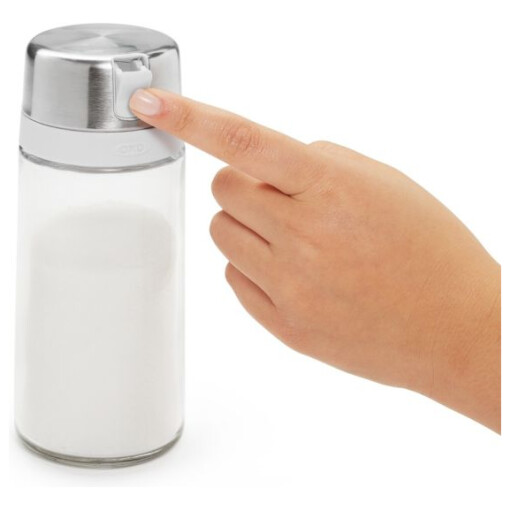 A spoonful of sugar is always close at hand with the OXO Good Grips Glass Sugar Dispenser. The side spout allows for easy, controlled pouring, making it perfect for coffee, cereal, fruit and more. The stainless steel accents make it great for countertop or table use. The clear glass body shows just how much sugar is left and the lid twists off to reveal a generous opening for easy refilling.