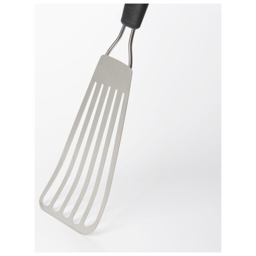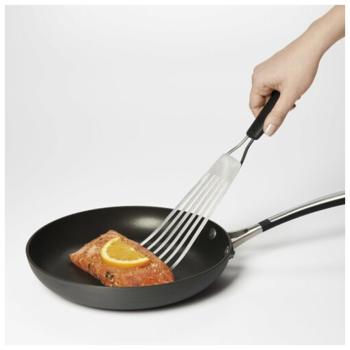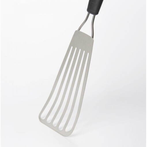 Use this handy Stainless Steel Fish Turner from Oxo when cooking whole fish, filets, seafood cakes and more. The beveled edge slides easily beneath foods and the slots in the head allow grease to drain. The durable, stainless steel head is oversized for larger fish and the soft handle allows for a comfortable grip.