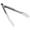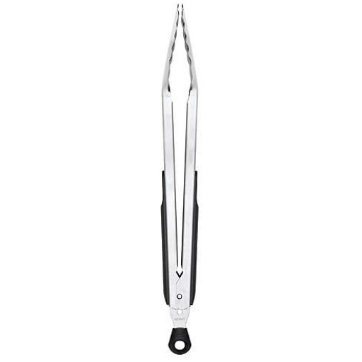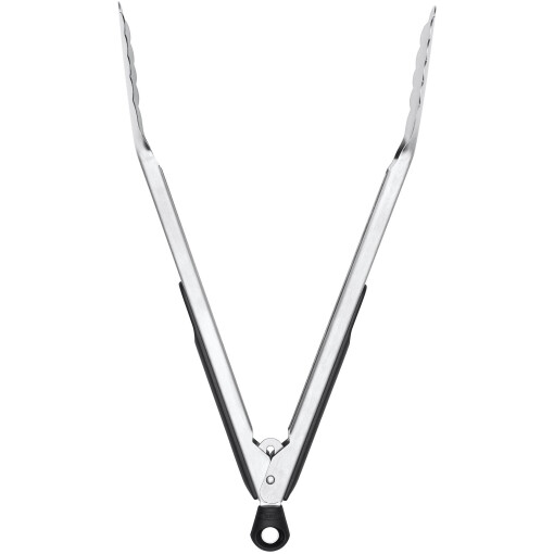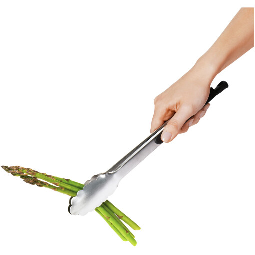 The OXO Good Grips 12″ Tongs feature brushed stainless steel with soft, non-slip handles and comfortable thumb rests. Easily lock in the closed position for convenient storage. The large pull-tab for locking also doubles as a hole for hanging.