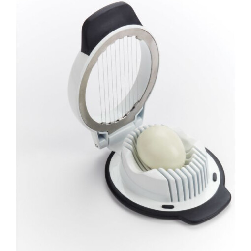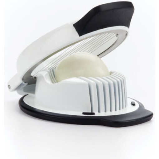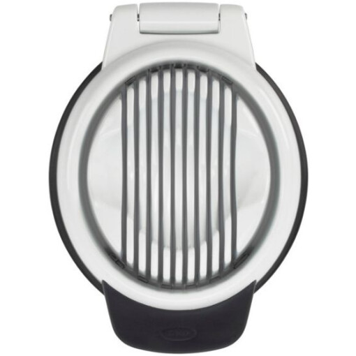 The OXO Good Grips Egg Slicer yields perfect 5 mm slices with one simple press. The holder cradles the egg in two directions, giving you the option of round or oblong slices. The raised handle is easy to open and close, and the non-slip base provides a comfortable grip while slicing over bowls or plates.