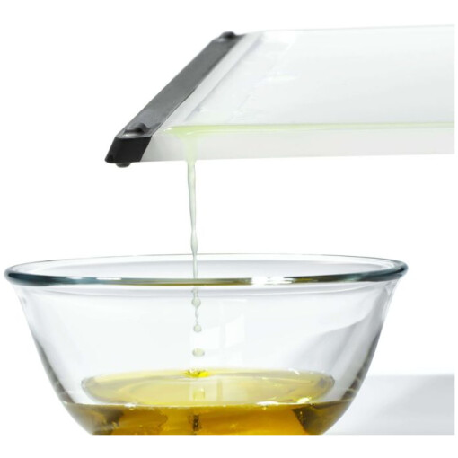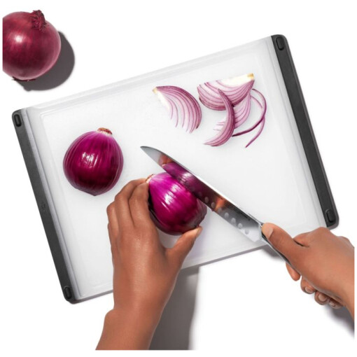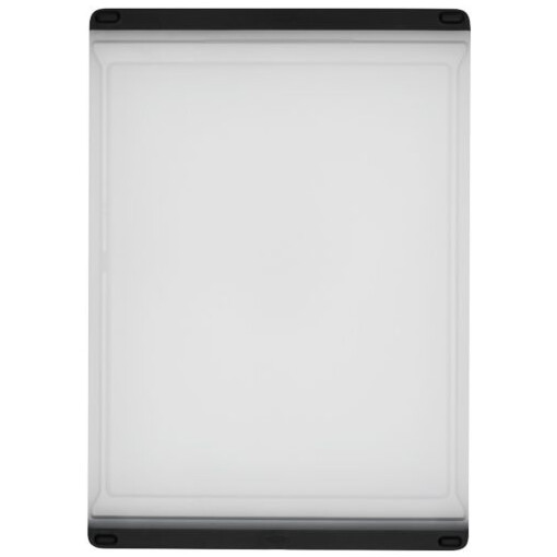 The OXO Good Grips Everyday Cutting Board is just the right size for dicing onions, slicing meat, preparing fruit salad and more. Non-porous construction locks out odors for a fresh cutting surface that resists deep scratches and goes easy on your knives. This double-sided board has a solid side for produce and a grooved side for meat, plus a drip catcher with easy-pour corners to take care of liquid run-off. Soft, tapered edges double as a comfortable handle, while non-slip feet keep the board in place as you slice. Dishwasher safe.