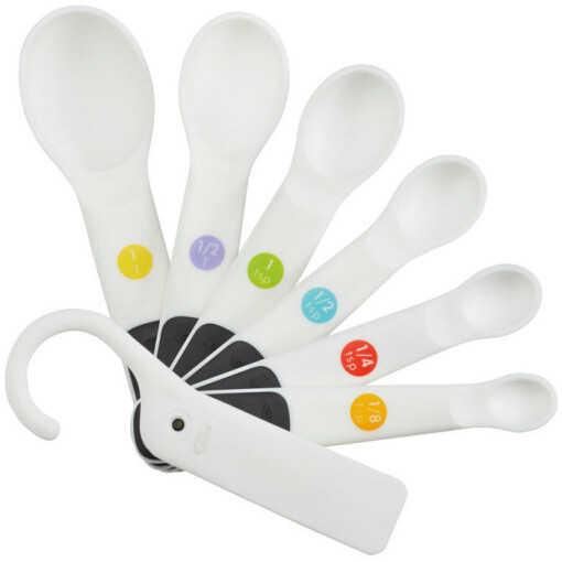 These 7 Piece Measuring Spoons Set have a fanning feature that allows you to take out the spoon you need, leaving the rest neatly snapped together. Handles have soft, comfortable, non-slip grips and color-coded, easy-to-read measurement markings. Spoons rest flat on countertops to prevent tipping. This dishwasher safe set includes a scraper, 1/8 tsp, 1/4 tsp, 1/2 tsp, 1 tsp, 1/2 T, 1 T Measuring Spoons