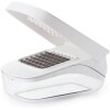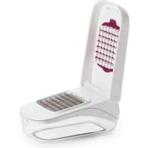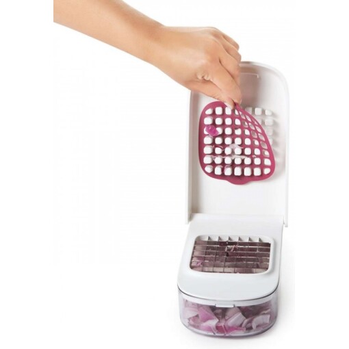 No more tears! Quickly and safely chop onions, peppers, and more in one easy motion, and easily pour chopped fruits or veggies without removing the lid. The stainless steel blade pattern and recessed cutting area keeps food in place while the lid provides leverage for efficient chopping.