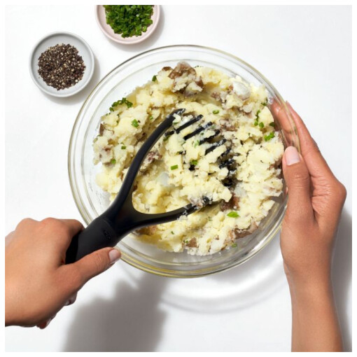 This Oxo Potato Masher is made of nylon so it will not harm non-stick cookware. This tool is not just for potatoes! Try mashing yams, carrots, or other root vegetables, or make homemade baby food by mashing apples and bananas. The soft, non-slip handle is designed to stay comfortable during repetitive motion, and it absorbs pressure to reduce strain. It includes a large in-handle hole for hanging storage. Dishwasher safe.