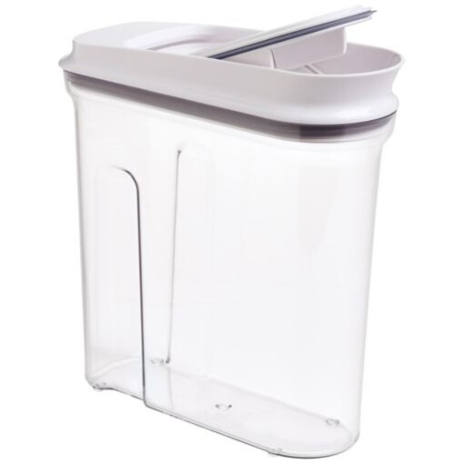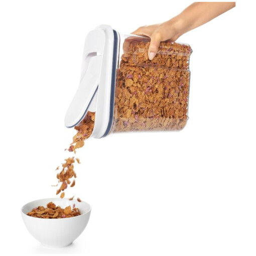 These OXO POP Cereal Dispensers feature pop-open lids for one-handed opening and closing. The smooth-pour spout is designed to prevent messy spills. Contoured for a comfortable hold, even when full. Shaped for efficient storage on countertops or in cabinets.