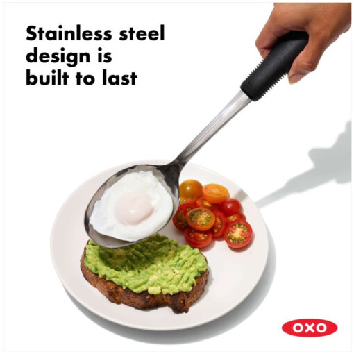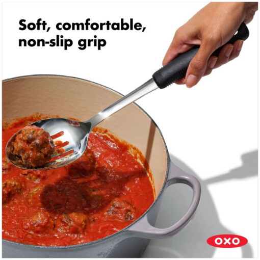 Our Stainless Steel Slotted Spoon is ideal for stirring and straining pasta or vegetables. The soft, non-slip handle cushions your hand during use, and the polished stainless steel is both sleek and durable.
