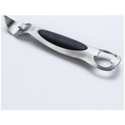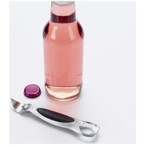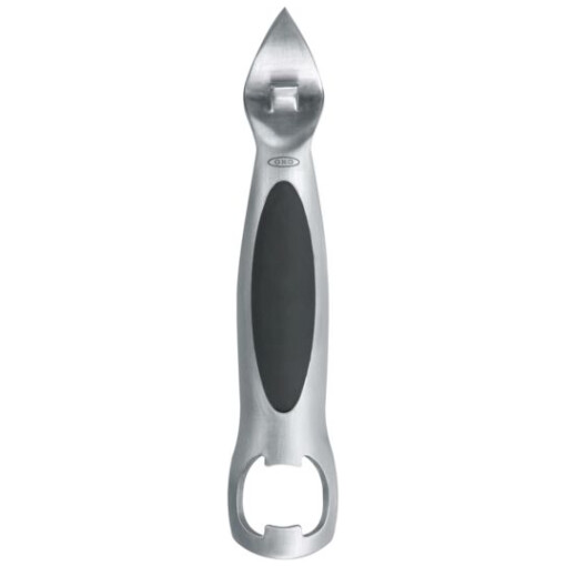 The OXO Steel Bottle Opener has a stainless steel body and heads that make it easy to open bottles and pierce cans quickly and cleanly. It features a soft, non-slip handle that cushions your grip.