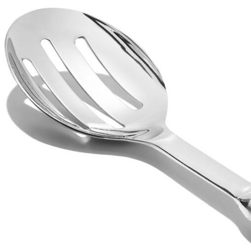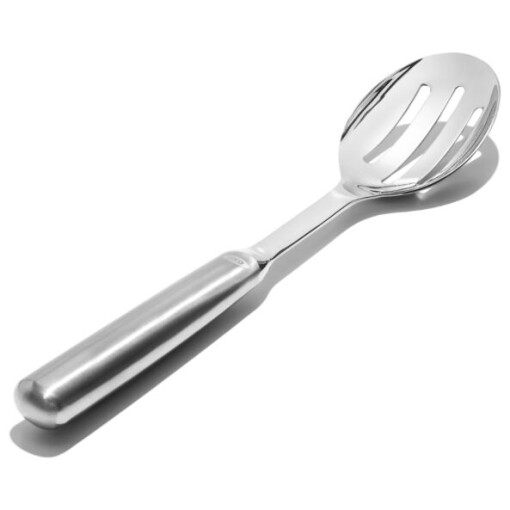 The OXO Slotted Serving Spoon can stir soups, pull potatoes out of boiling water, strain vegetables, serve meatballs, and more. The sturdy stainless steel construction can stir up even the thickest stews, and lift heavy pieces of meat from a pot. The slots allow liquid to drain through without making a mess.