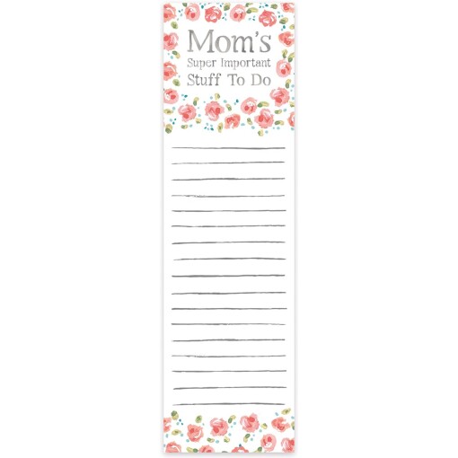A list notepad from our Mother’s Day Collection displaying a watercolor design of flowers around a fun “Mom’s Super Important Stuff To Do” sentiment with lined writing space underneath. Includes 60 pages and a strong magnet to easily hang on magnetic surface. Our Mom’s Stuff To Do list pad is proudly made in the USA.