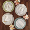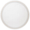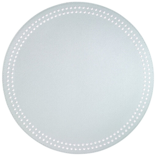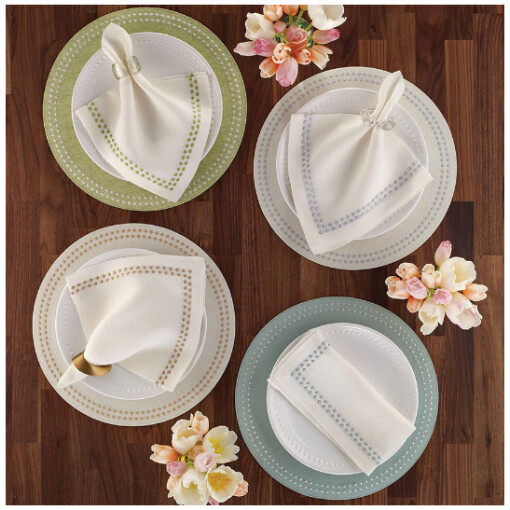 Round mats with pearl-like embroidered dots around the edge add a touch of classiness to any tablescape. Available in multiple colors.