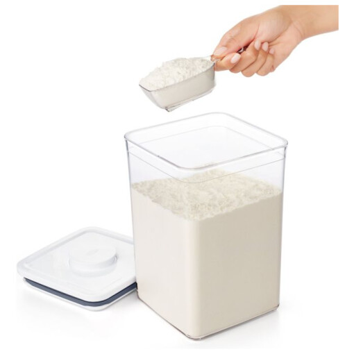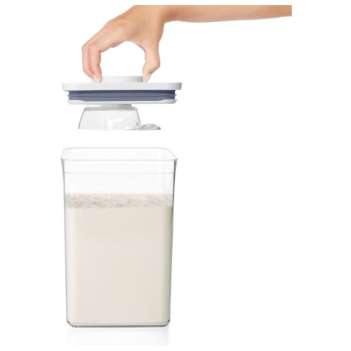 Fits POP Containers with lid type: Big Square, Rectangle and Slim Rectangle. Recommended for use with the OXO POP Container, Rectangle Medium (4.4 Qt/4.2 L), sized for 5 lbs of rice.