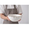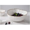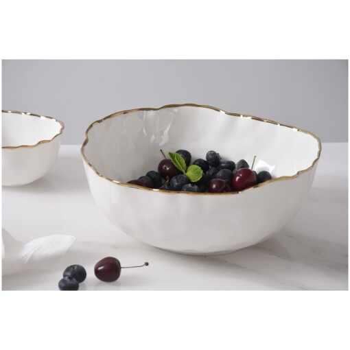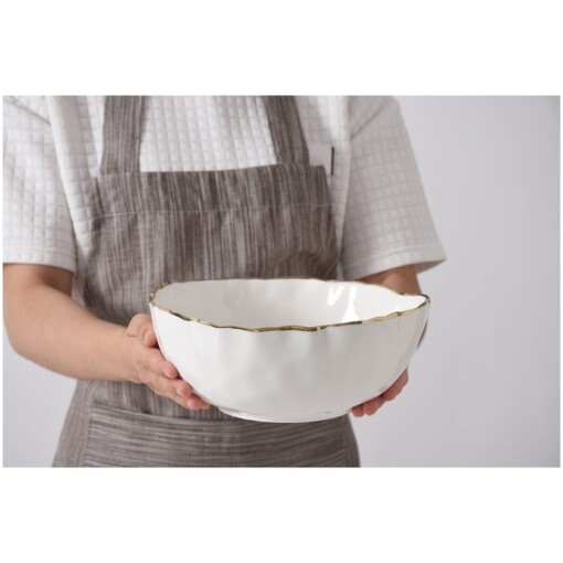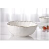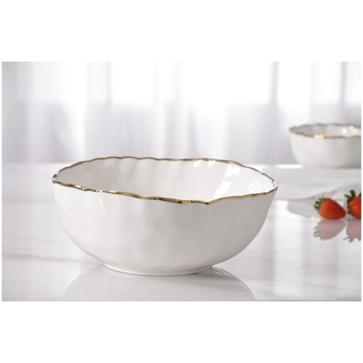 Medium Bowl in Portofino. Great for individual serving of pasta, salad or chips. Gorgeous white porcelain with a delicate gold trim. Food safe, tarnish free, dishwasher safe, oven safe to 500°. Easy Care.
