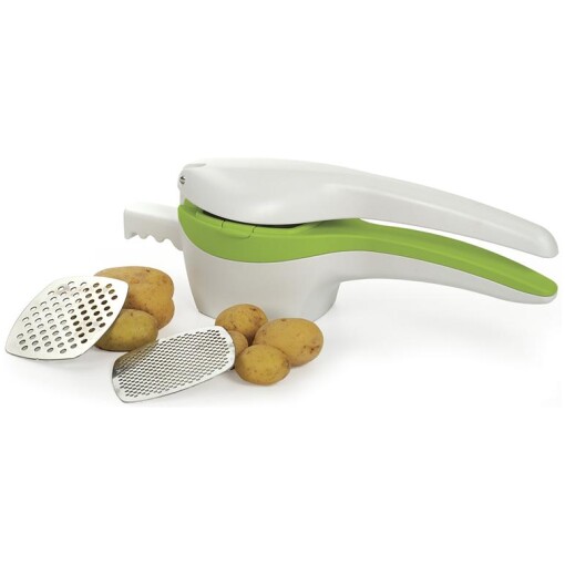 Finally an easy way to mash and strain food with this Potato Ricer from RSVP. This handy potato ricer has two different screens for ricing potaoes, mashing baby food or “squeeze drying” spinach. It features one medium and one course stainless steel plate and is made of durable heavy duty plastic. The pot extension will hold the ricer steady over most pots, and it has comfortable contoured handles.