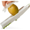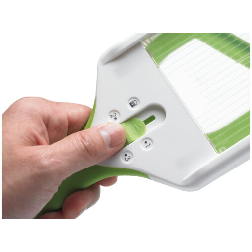 Now you can slice and julienne with this hand held mandoline slicer. Slice potatoes for scalloped potatoes or kiwi for fruit salad then flip the knob to pop up the julienne blades and cut zucchini for stir-fry or carrots for garnish. The slicers easy adjustment button allows you to select the perfect thickness for your task. Non-skid base and ridges keep mandoline slicer stable on cutting surface and allow for use over a bowl. Wider slicing surface will accommodate larger produce and angled blade provides more efficient slicing.The slicers easy adjustment button allows you to select the perfect thickness for your task.