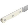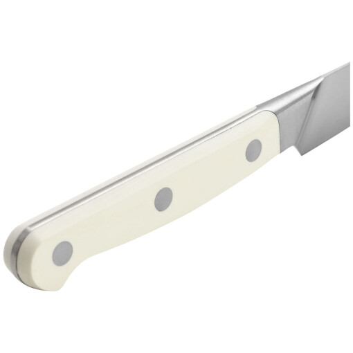 ZWILLING Pro, the most user-friendly knife on the market, is now available with elegant matte white handles. ZWILLING Pro Le Blanc boasts a unique curved bolster that acts as an extension of the hand, supporting the professional pinch grip, with thumb and index finger on the blade, for safe cutting and less fatigue. The blade was designed with a broad curve in the front to facilitate the rocking motion of Western cutting, while the straight back is ideal for the Asian chopping motion. The full length of the blade can be used when cutting and can be sharpened from bolster to tip.