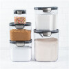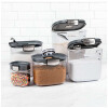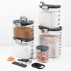These Progressive ProKeeper Plus storage container stores and measures brown sugar worry-free and mess-free. The clear containers feature airtight silicone gasket seals to preserve freshness, and a stainless steel easy-lift latch and a secure side grip. Each of the mini-keepers can store a box of baking soda or baking powder and include a shaker and sliding leverer for accurate measuring. The brown sugar container is outfitted with terracotta tamper in a dedicated compartment to keep sugar moist. Stored inside the lid, the magnetic leveler is a handy feature to the flour storage container, while the sugar storage container is equipped with a funneled spout for easy pouring. The powdered sugar houses a stainless steel dusting spoon with magnetic closure neatly in its lid. Dishwasher safe.