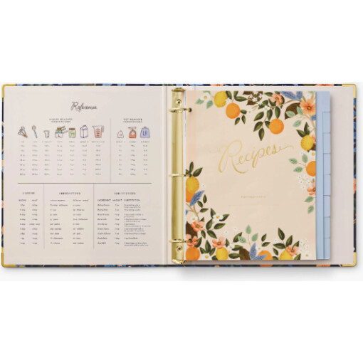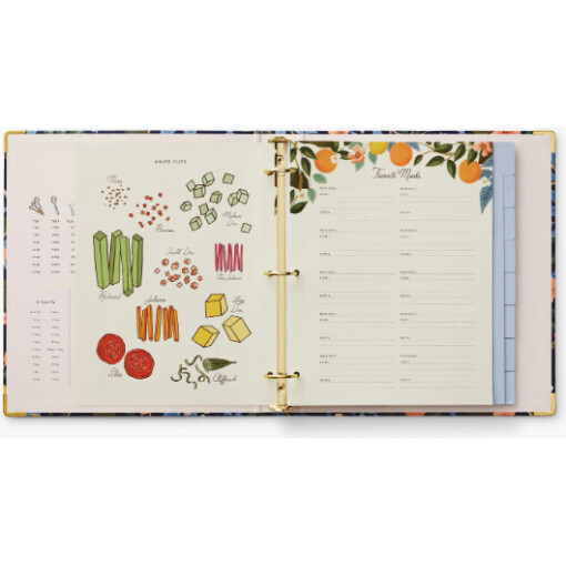 A recipe binder that is both a resource and a keepsake. It’s a place to organize family favorites and new meals to try, and is complete with helpful details to stay organized in the kitchen. The illustrated three-ring recipe binder has gold foil accents, reinforced metal corners, a double-sided pocket folder, 16 tabbed dividers, 10 clear recipe card sleeves, adhesive labels, and reference pages.