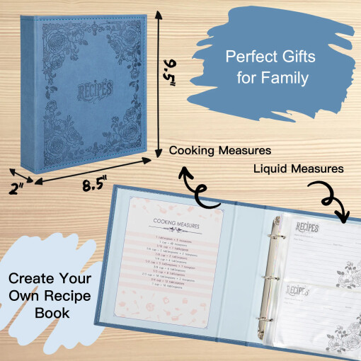 - The recipe book have enough room to hold all of your favorite recipes. With all the recipes in one place inside our recipe binder, cooking will be a breeze! This elegant recipe book holder includes: 1 x 8.5″(L)x9.5″(H)x2″(W), recipe binder spine, 40 x 4″x6″ recipe cards, 20 x clear protector sheets (each page holds two recipes), 12 x tabbed category dividers.
