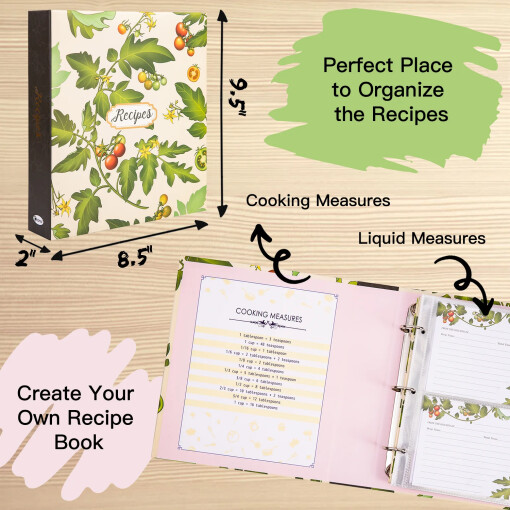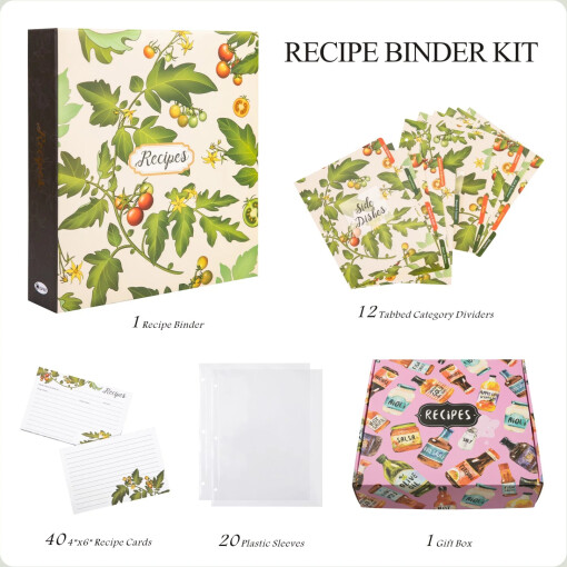- The recipe book have enough room to hold all of your favorite recipes. With all the recipes in one place inside our recipe binder, cooking will be a breeze! This elegant recipe book holder includes: 1 x 8.5″(L)x9.5″(H)x2″(W), recipe binder spine, 40 x 4″x6″ recipe cards, 20 x clear protector sheets (each page holds two recipes), 12 x tabbed category dividers.