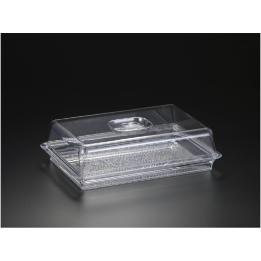 This Rectangular tray with textured bottom is from Huang Acrylic. It features a cover with recessed handles, making it a great cake dome. It measures 12 5/8 x 8 3/4 x 3 3/8 inches.
