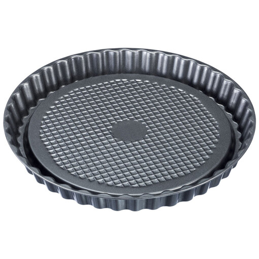 This quality German made Flan Pan or Fruit Tart Tin features a waffle textured bottom that promotes easy release of baked goods and uniform browning. Sturdy steel construction with special Swiss non-stick coating. Easy to clean.