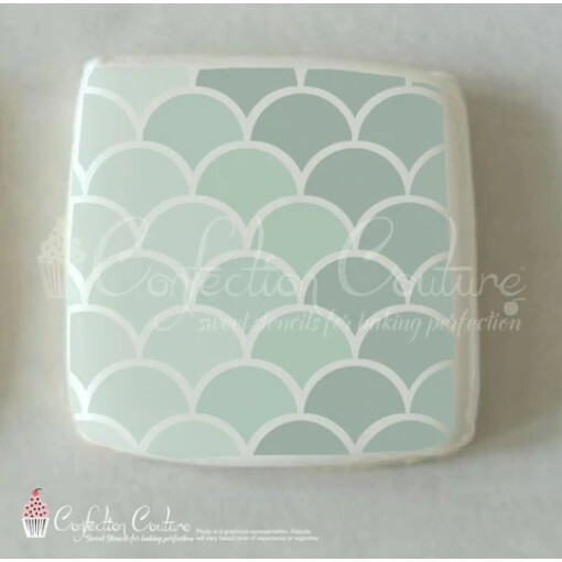 The Confection Couture Scales background cookie stencil is laser cut on 10 mil food-safe material and works great with airbrushing, royal icing and other confectionery medium applications.
