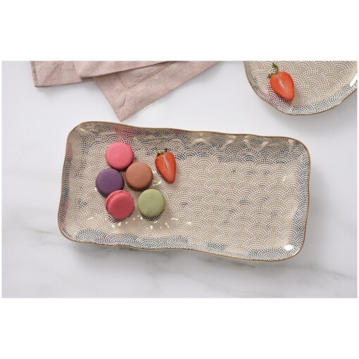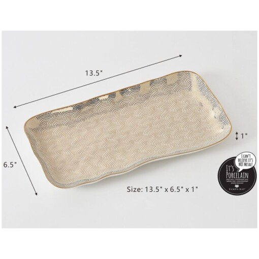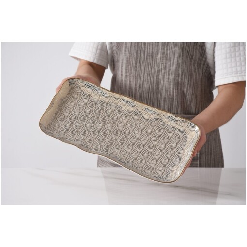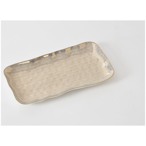 Rectangular Tray in Sensu. Perfect for serving bite-size appetizers and desserts like mini-cupcakes, cookies, and deviled eggs. Or pair with a small bowl for a wonderful crudité and dip. Beautifully crafted in a stunning white porcelain with gold detail. Inspired by the beauty and unique shape of the Japanese folding fan called Sensu.