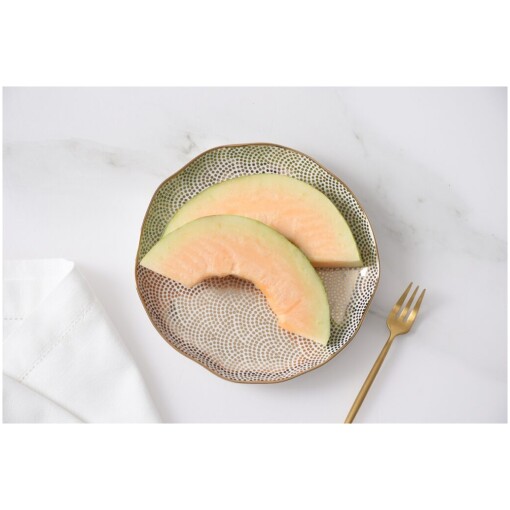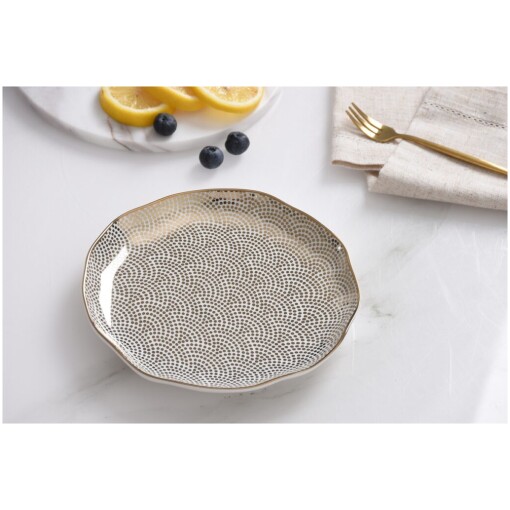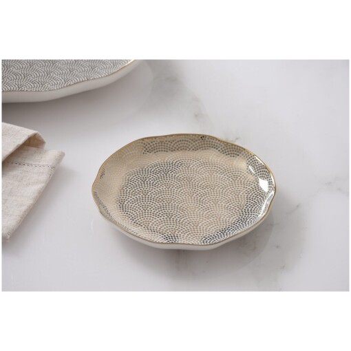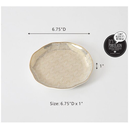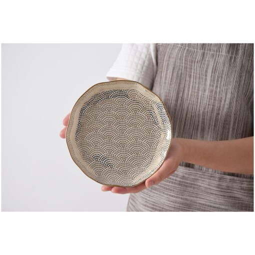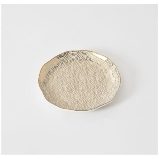 Round Appetizer/Dessert Plate in Sensu. Impress with your culinary skill and presentation by serving up delicious appetizers and pastries on these stunning plates. Beautifully crafted in a stunning white porcelain with gold detail. Inspired by the beauty and unique shape of the Japanese folding fan called Sensu.