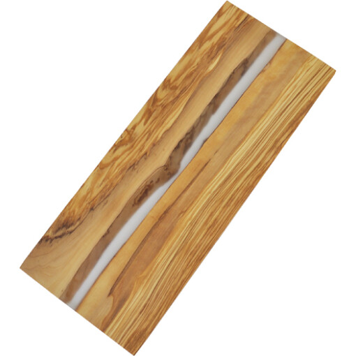 The olive wood board has a river of clear resin cutting through the middle. The resin allows you to see the natural edging of the olive wood through the middle of the board.
