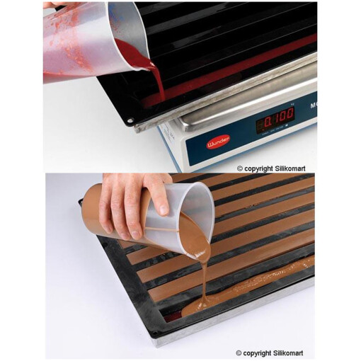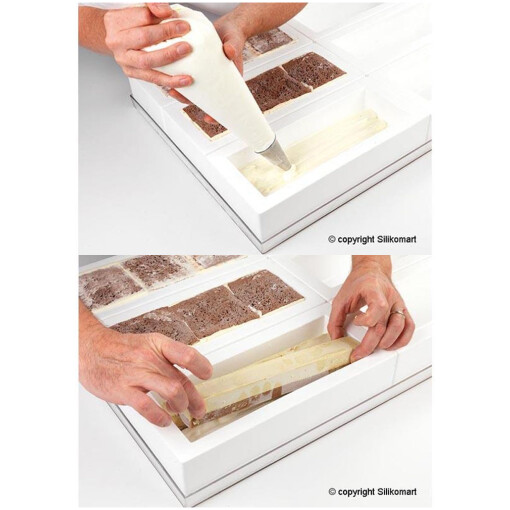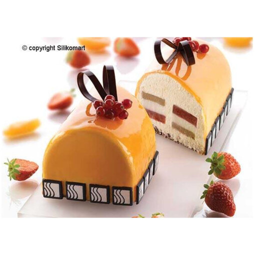 “Tortaflex” (as the company calls it) silicone mold with a log shape, or “buche” in European. Volume of 220×60 mold is 565ml (19 ounces). Made of flexible silicone. The mold is resistant to cold down to -76F (-60C) and heat up to 446F (230C), letting you bake a cake or make ice cream and get it out easily thanks to the non-stick property and flexibility of the mold. The mold’s integral frame makes it stable, and its suppleness lets you push your baked or frozen product out from the bottom.