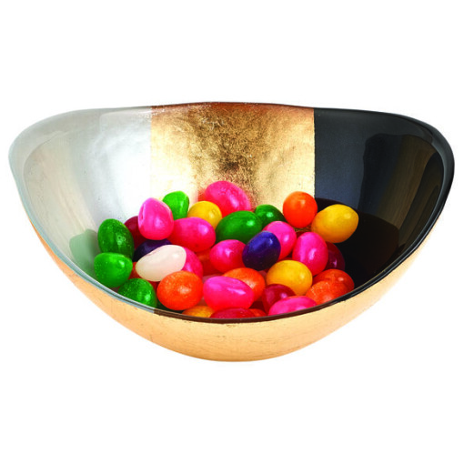 New Bold yet elegant design, this Oval Gold, Black and White 6 x 5.25 ” Glass Bowl makes quite the statement, whether its a wedding gift or housewarming occasion, the recipient will love this glamourous contrasting yet tasteful design. This cutie is perfect for nuts, candy, mints. potpourri etc.