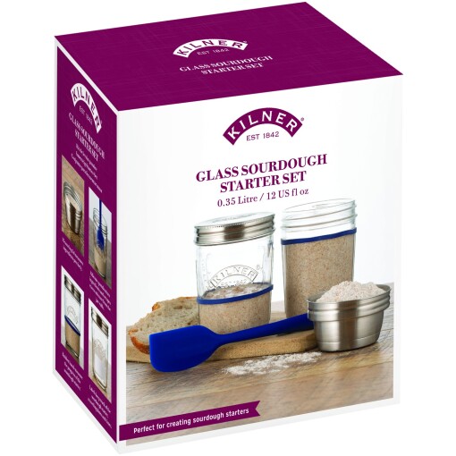 The KilnerĀ® Sourdough Starter Set contains all components needed to make a successful sourdough starter, which will then be used to transform into a fresh and delicious sourdough loaf. Pancakes, pizza, naan breads and other baked goods can also be made from a sourdough starter. Two jars are included in the set allowing a second batch to be created whilst the first batch is in use.