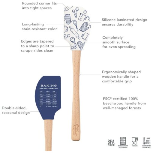 - Convenient Design: Classic navy and white baking themed wood handled spatula features a handy baking conversion guide to add a practical, yet fun touch to the kitchen!