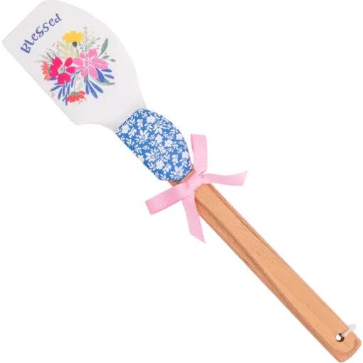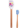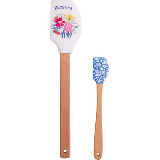 This wood handled spatula set is adorned with a artful floral design, bringing a bit of fun into your baking! This spatula set features BPA-free silicone tops and beechwood handles for safety and comfort. The large spatula includes a measuring conversion table on the back. Heat resistant up to 500 degrees, stain-proof, and dishwasher-safe silicone tops make cooking hassle-free. The set conveniently includes a large spatula (2.5″ x 12.75″) and a small spatula (1.25″ x 8.25″), making this a great gift!
