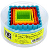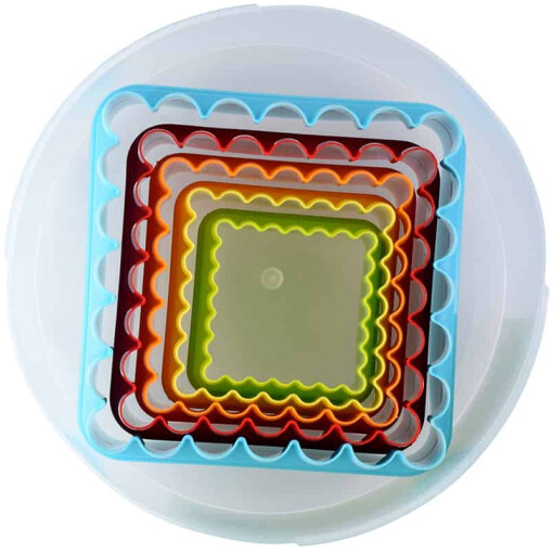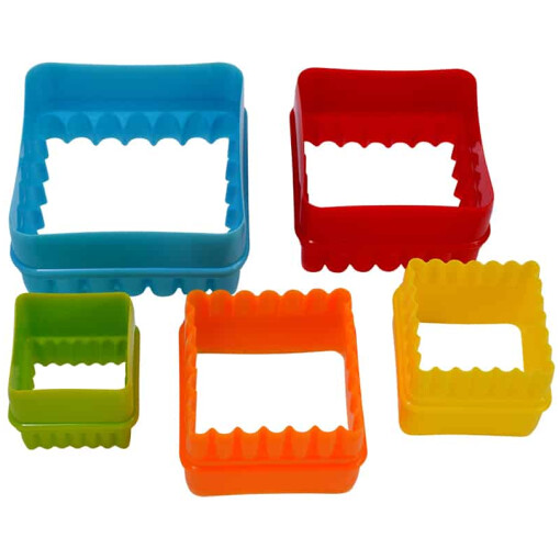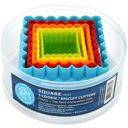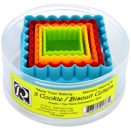 Made of bright colorful plastic, this 5-piece set of Square biscuit cutters are also great for cookies, pancakes, sandwiches and more. Sizes include: 1-3/8″, 1-5/8″, 2″, 2-1/2″ and 3″. Packaged in a round container for easy storage. Top rack dishwasher safe.