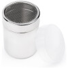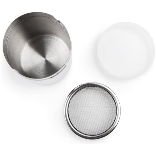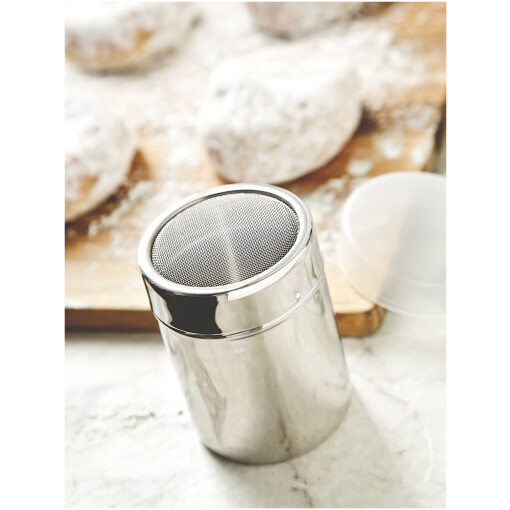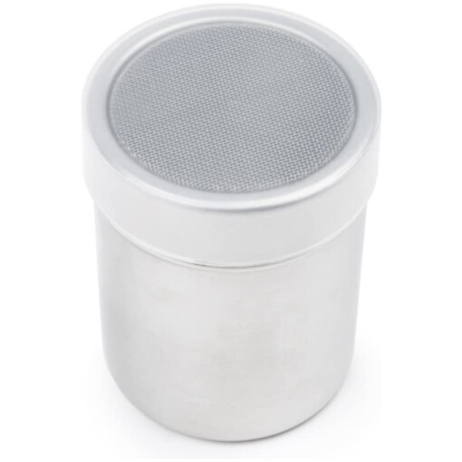 This stainless steel multi-purpose shaker with mesh top, by Fox Run, is perfect for salt, sugar, flour and spices. Twist and lock lid. 4″ tall; includes plastic storage lid. Nice looking metal shaker.