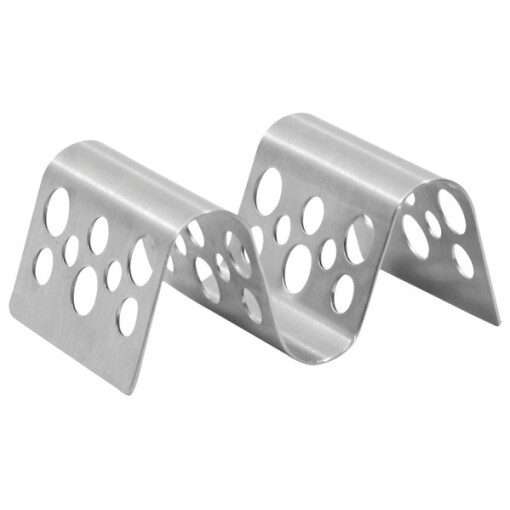 This Tablecraft Stamped Circles Stainless Steel Taco Holder provides a convenient place for guests to set their authentic tacos down without creating a mess. It holds food upright, ensuring savory fillings and fresh toppings stay in place between every bite. This server is perfect for both back-of-house preparation and table displays, reducing mess and creating a neat taco presentation. It allows chefs to put a meal together quickly and efficiently, and guests can enjoy their tacos at their own pace. Switch between holding 1 or 2 tacos by simply flipping the Tablecraft holder upside down.