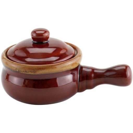 This onion soup crock is crafted of porcelain. The Elegant French inspired design provides thick comfortable handles. Includes a knobbed lid which helps maintain optimum serving temperature. Each crock measures 4″ by 4.5″ by 7″. Dishwasher safe, oven safe, freezer safe, and microwave safe. Holds 16 oz.