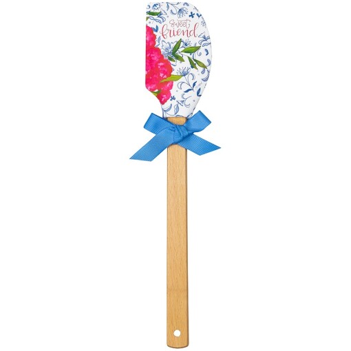 Designer silicone spatula with a measuring table on the back. Heat-resistant to 500 degrees F, stain-proof and dishwasher safe.