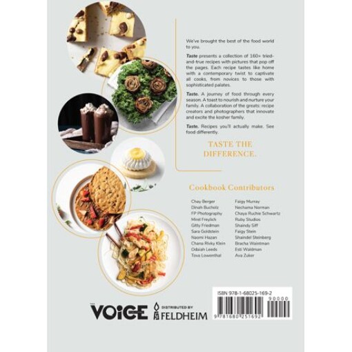 Taste presents a collection of 160+ tried-and-true recipes with pictures that pop off the pages. Each recipe tastes like home with a contemporary twist to captivate all cooks, from novices to those with sophisticated palates. With a full scope of standard sections such as meat, chicken, desserts and baked goods, Taste also includes innovative sections like drinks and pops, healthy eats and complete Yom Tov fare. Inspirational articles and poems round out the cookbook and make Taste a collectible. Taste. A journey of food through every season. A toast to nourish and nurture your family.