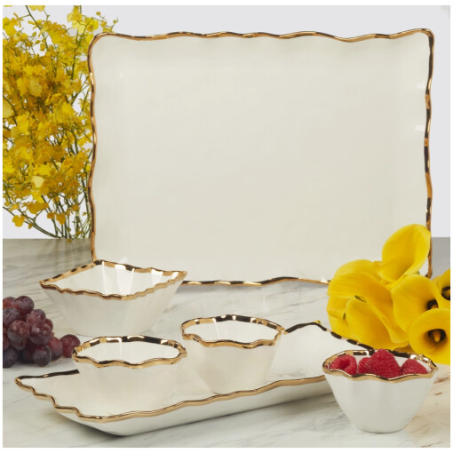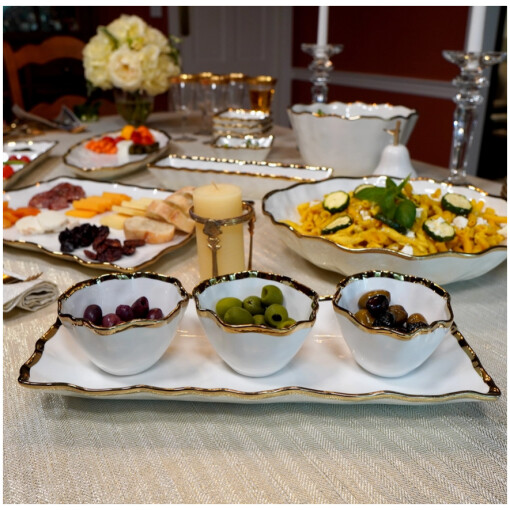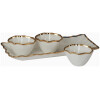 The Regency Gold 4pc Tray and Condiment Set is the epitome of elegance and practicality. This beautifully crafted set includes a stylish tray and three condiment bowls, all adorned with delicate gold accents. Perfect for serving sauces, dips, or small snacks, this set will impress your guests and heighten your entertaining style.