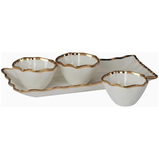 Includes one tray and three matching condiment bowls.