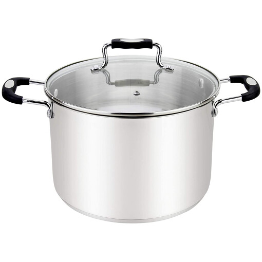 Carefully crafted from quality stainless steel that will not rust or corrode, this large stock pot is designed to be compatible with all kinds of cooktops – gas, induction, halogen and electric. It features stay cool silicone handles – riveted on for extra durability – so you don’t have to worry about burning your fingers when you cook, and a see-through glass lid that allows you to see at a glance where your food is up to. Vented steam hole prevents rattling and overboiling. This medium sized metal pot holds four quarts – great for making stews, simmering soups, or cooking pasta. It measures 9.5 inches in diameter and is dishwasher safe for a super simple cleanup.