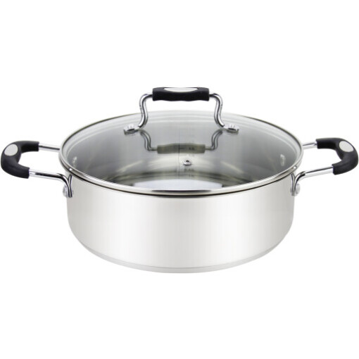 Carefully crafted from quality stainless steel that will not rust or corrode, this low stock pot is designed to be compatible with all kinds of cooktops – gas, induction, halogen and electric. It features stay cool silicone handles – riveted on for extra durability – so you don’t have to worry about burning your fingers when you cook, and a see-through glass lid that allows you to see at a glance where your food is up to. Vented steam hole prevents rattling and overboiling. This big metal pot holds 8.4 quarts – great for making stews, simmering soups, or cooking pasta. It’s dishwasher safe for a super simple cleanup.